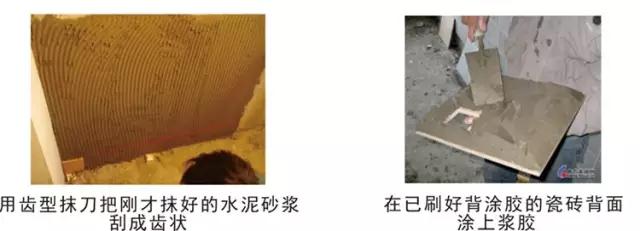 使用背涂膠鋪貼瓷磚,可使用傳統(tǒng)的點(diǎn)貼法,即將攪拌好的漿膠(水泥砂漿或瓷磚膠)刮在瓷磚的背面,然后再將其貼于基材之上。但這種貼法效果還不是最好,因此我們強(qiáng)烈推薦使用刮板法,具體方法如下: