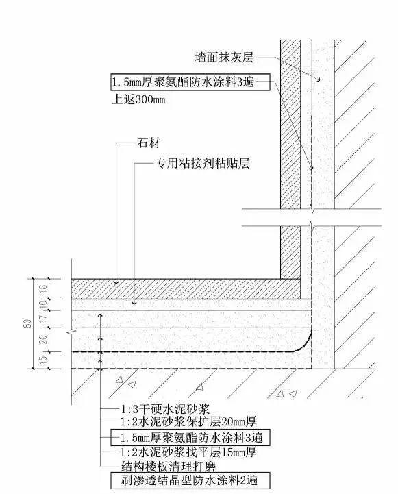 衛(wèi)生間濕區(qū)(淋。┎捎脙傻婪浪唧w做法為:結(jié)構(gòu)樓板打磨+第一道防水:滲透結(jié)晶型防水涂料兩遍,淋浴區(qū)墻體到天花吊頂(大于1.8米),其他部位墻體上返300mm+水泥砂漿保護(hù)層+第二道防水:1.5mm厚聚氨酯防水涂料,上返300mm+水泥砂漿保護(hù)層。