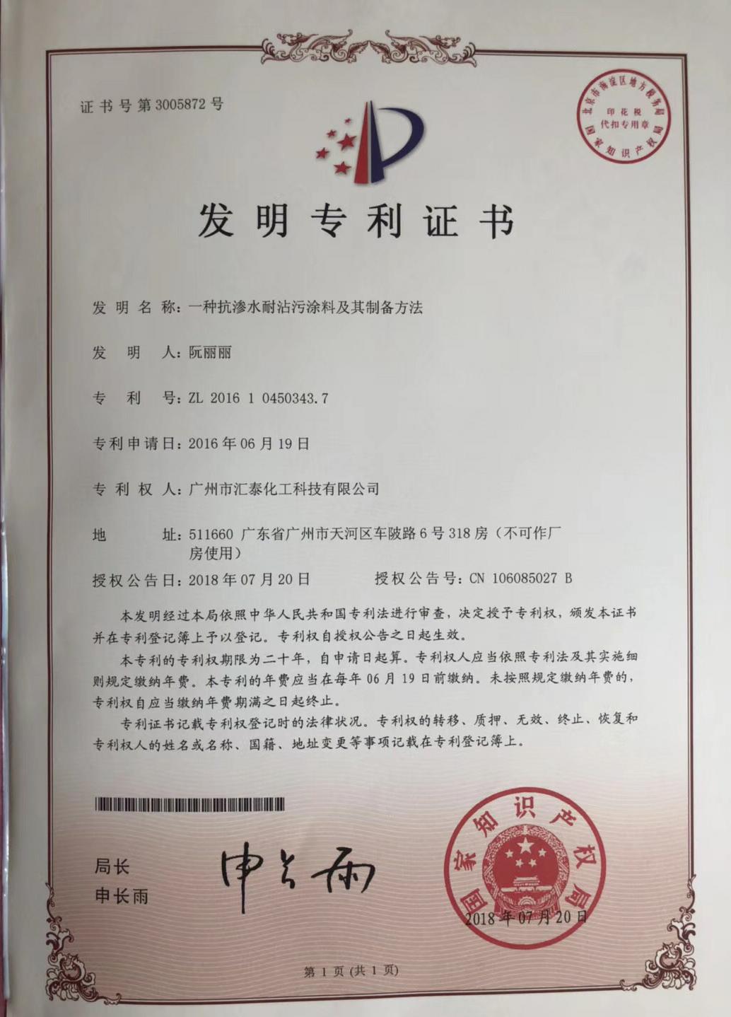 引文:喜大普奔,熱烈祝賀廣州市匯泰化工科技有限公司旗下“抗?jié)B水耐沾污涂料”榮獲國家知識產權局頒發(fā)“發(fā)明專利證書”。