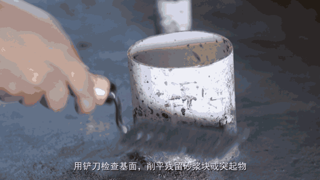 ▲用鏟刀、毛刷等工具清掃墻地面的浮土和泥沙,確;鶎悠秸。這個過程雖然歷時較長,可真不能馬虎。觀察地漏的下水速度,若下水很快,并伴有咕嚕聲就表明下水良好,否則應(yīng)疏通后再施工。一定要先用水泥砂漿將地面找平,再做防水處理。在做防水之前,一定要將地面清理干凈,用聚氨酯防水涂料反復(fù)涂刷2~3遍,并注意涂料的厚薄一致,可避免涂料因厚薄不均而造成滲漏。