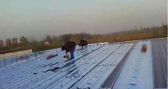 3、需要在防水層上頻繁地進(jìn)行其他工種施工作業(yè)的情況:如在屋面上設(shè)計(jì)有彩鋼坡屋頂。通常情況下是在彩鋼坡屋頂沒有安裝彩鋼板前,鋪設(shè)防水卷材。在安裝彩鋼板時(shí),施工作業(yè)人員要頻繁踩踏卷材,難免要對防水層造成破壞,而滿粘的卷材在一定程度上可以承受這種外力的沖擊,而不至于移位,接縫撕裂。