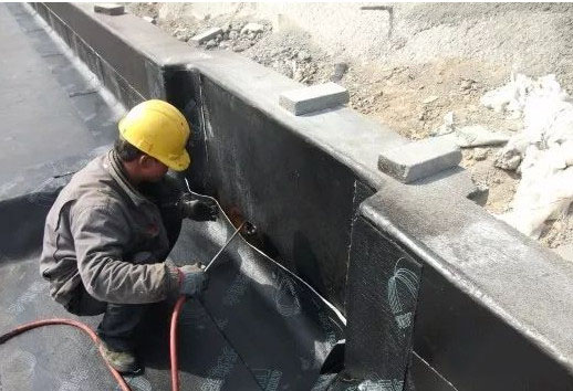 (1)卷材采用一層的,厚度不得小于4mm,采用兩層的,每層厚度不得小于3mm。立墻側(cè)壁采用滿粘,不得有空鼓,底板采用點(diǎn)粘或空鋪。卷材施工采用熱熔法施工,大面卷材與附加層之間應(yīng)粘接牢固。從底板折向外墻立面與永久性保護(hù)墻接觸的部位應(yīng)采用空鋪,與臨時(shí)性保護(hù)墻交接部位應(yīng)將卷材臨時(shí)固定于保護(hù)墻上。