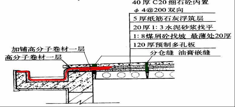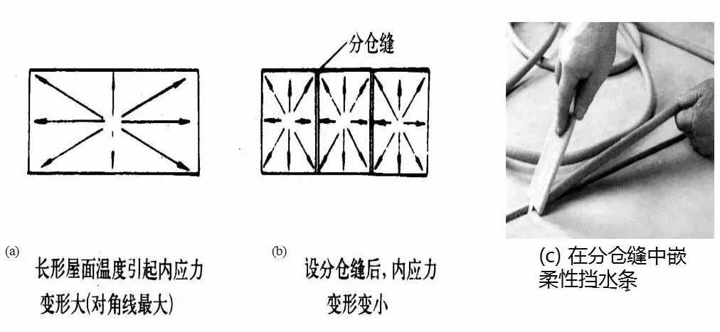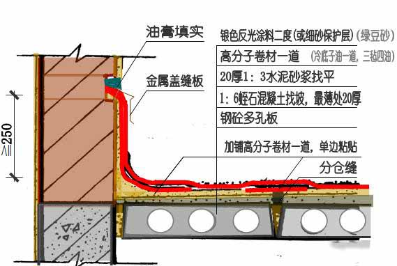 用來找坡和找平的輕混凝土和水泥砂漿都是剛性材料,在變形應(yīng)力的作用下,如果不經(jīng)處理,不可避免地都會(huì)出現(xiàn)裂縫,尤其是會(huì)出現(xiàn)在變形的敏感部位。這樣容易造成粘貼在上面的防水卷材的破裂。所以應(yīng)當(dāng)在屋面板的支座處、板縫間和屋面檐口附近這些變形敏感的部位,預(yù)先將用剛性材料所做的構(gòu)造層次作人為的分割,即預(yù)留分倉縫。即便屋面的構(gòu)成為現(xiàn)澆整體式的鋼筋混凝土,也應(yīng)在距離檐口500mm的范圍內(nèi),以及屋面縱橫不超過6000mm×6000mm的間距內(nèi),作預(yù)留分倉縫的處理。分倉縫寬約10~30mm,中間應(yīng)用柔性材料及建筑密封膏嵌縫 。