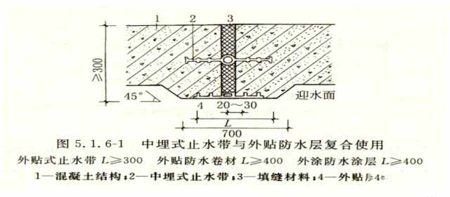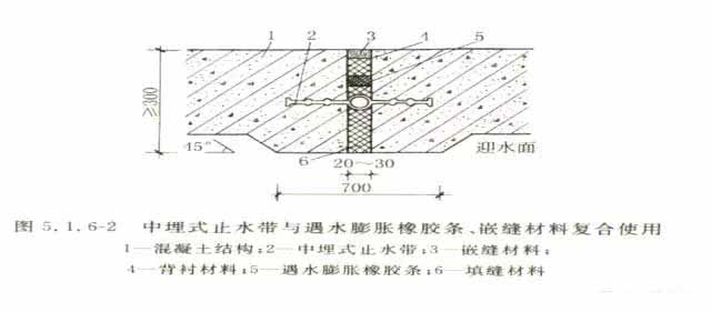施工縫處采用遇水膨脹橡膠膩?zhàn)又顾畻l時(shí),一是應(yīng)采取表面涂緩膨脹劑措施,防止由于降雨或施工用水等使止水條過早膨脹;二是應(yīng)將止水條牢固地安裝有縫表面預(yù)留槽內(nèi)。