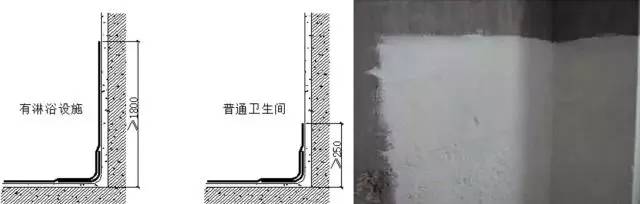 地面四周與墻體連接處,防水層應往墻面上返300mm以上,有淋浴設施的廁浴間隔墻面,防水層高度不應小于1.8m。