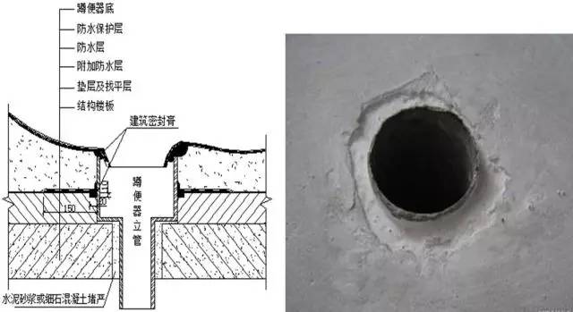 管根與混凝土(水泥砂漿)之間應留凹槽,槽深10mm、寬20mm,槽內嵌填密封膏;蹲便器底部與立管相接處應加設密封膏。