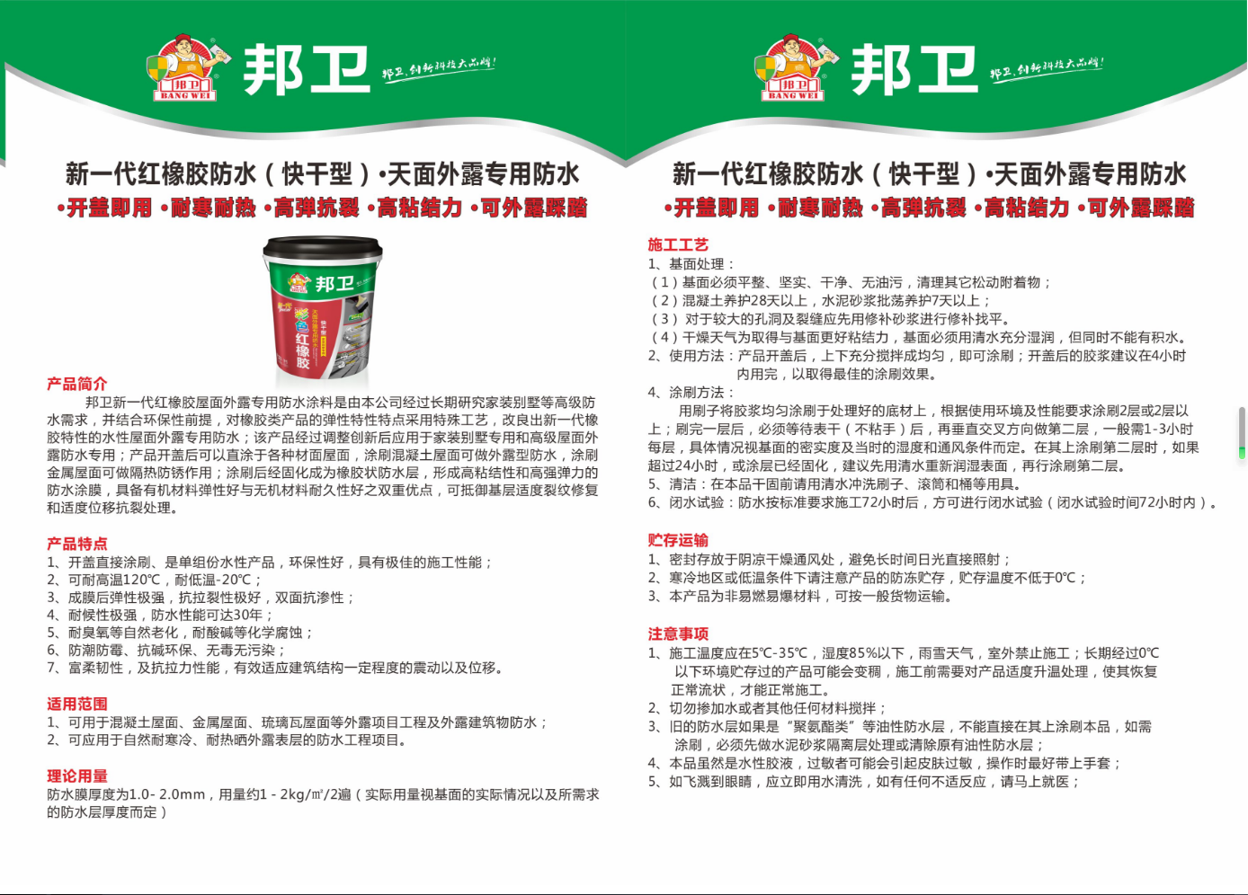 1、開蓋直接涂刷、是單組份水性產(chǎn)品,環(huán)保性好,具有極佳的施工性能;